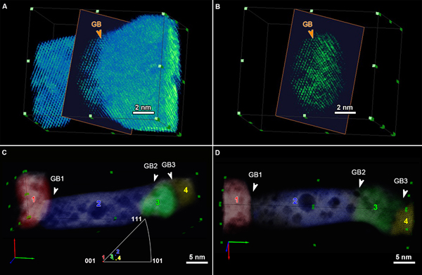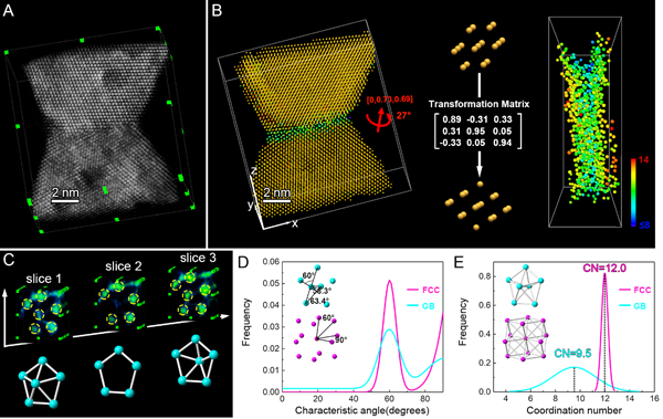 图1 双晶及多晶金属的原子分辨率电子层析三维重构