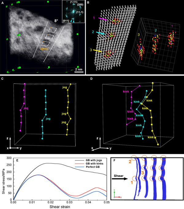 图3 小角晶界(位错型晶界)的三维原子结构、晶界位错的扭折和割阶组态及行为