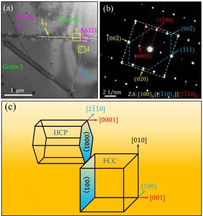 近期,李阁平研究组在大量透射电子显微镜实验研究基础上,发现了一种新位向关系的FCC相。经过选区电子衍射标定,这种类型FCC相与基体的位向关系为: