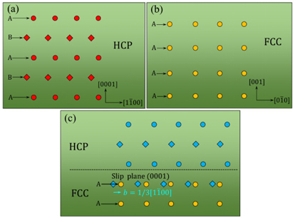 方向经历晶格膨胀。其次比较HCP和FCC的原子堆垛方式,发现相变过程还包括HCP基面上,伯氏矢量为1/3