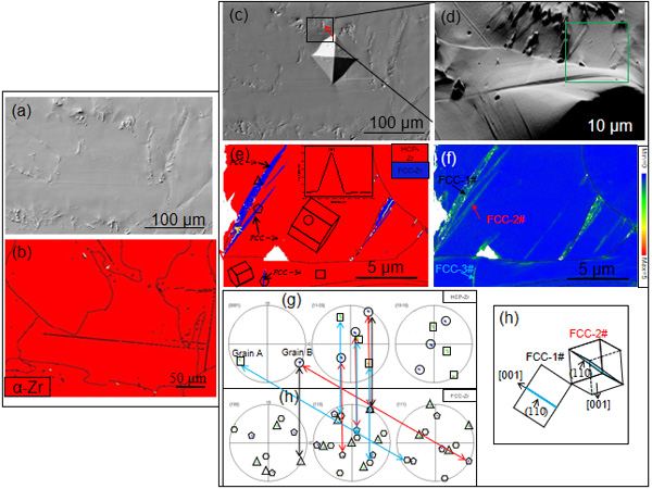 图1 应力诱导FCC-Zr的形成。 (a-b) 硬度压痕变形前的 α-Zr相,(c-h) 压痕变形后的α-Zr相和应力诱导形成的FCC-Zr相