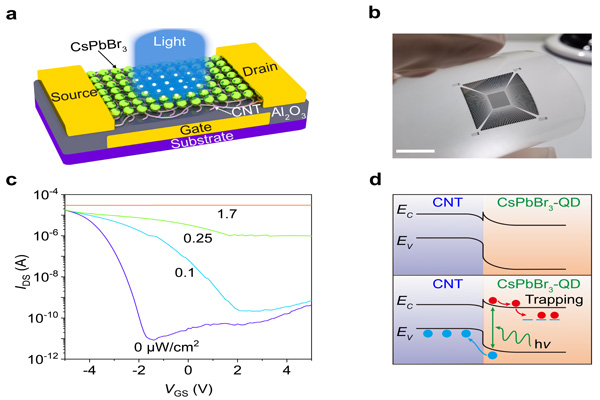 图1. 单元器件设计与性能。半导体性碳纳米管和无机钙钛矿量子的复合薄膜构成器件的沟道材料。其中,量子点作为感光层和光生电荷俘获层,高纯度半导体性碳纳米管薄膜作为载流子传输层。a. 结构示意图;b. 柔性人工视觉芯片外观图(标尺,5 mm);c. 不同光强下的器件转移特性曲线;d. 暗态(上图)与光照(下图)条件下的作用机制。