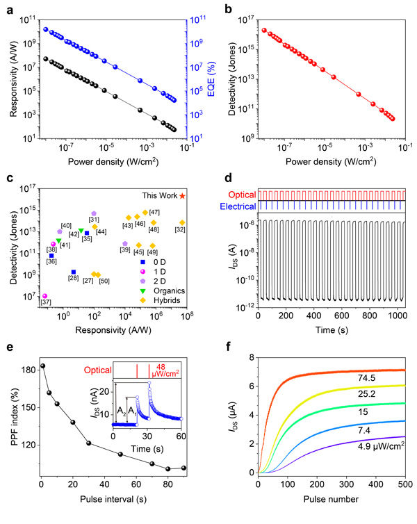 图2. 光电响应与神经突触特性。a. 响应度、外量子效率与激光功率密度关系,其中响应度高达5.1×107 A/W; b. 探测度与激光功率密度关系,其中探测度高达2×1016 Jones;c. 基于不同类别材料的器件响应度-探测度综合性能对比;d. 光学和电学激励下的器件开关响应特性,其中信噪比大于>105;e. 人工神经突触的双脉冲易化(PPF)性能;f. 人工神经突触的长程增强现象。