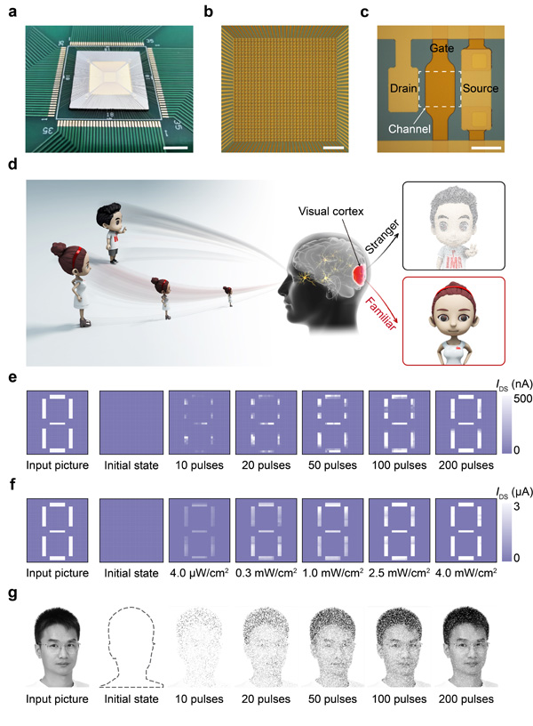 图3. 碳纳米管-量子点神经形态人工视觉光电传感器。a. 人工视觉芯片外观图(标尺,5 mm);b. 1024像素传感器阵列光学照片(标尺,0.5 mm);c. 单元像素的光学照片(标尺,20μm); d. 人类视觉皮层针对不同人脸形成的差异性印象的示意图;e. 初始状态以及在10、20、50、100和200个光脉冲训练后数字“8”突触权重结果。其中,激光波长405nm,激光功率密度 1μW/cm2,光脉冲宽度250ms,脉冲间隔250ms;f. 初始状态以及在4.0μW/cm2, 0.3mW/cm2, 1.0mW/cm2, 2.5mW/cm2 和 4.0mW/cm2功率密度下训练10个光脉冲后数字“8”的突触权重结果。其中,激光波长405nm,光脉冲宽度250ms,脉冲间隔250ms;g. 人类面部(论文第一作者)的识别训练过程模拟。