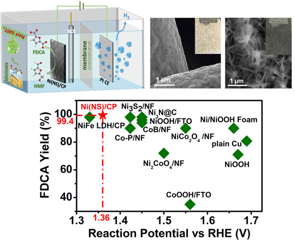 生物质作为一种新型的可再生非化石资源,被认为是潜在化石资源替代品。5-羟甲基糠醛(HMF)作为生物质资源的重要代表性平台产品之一,可以作为原料生产多种高附加值化合物。将电氧化HMF与在新能源领域中具有重要研究意义的析氢反应耦联是一种极具应用前景的绿色策略,不仅能够突破电催化水裂解体系的动力学瓶颈,而且能够有效降低体系电能消耗。然而,目前该研究方向仍处于概念验证的初始阶段,并面临许多挑战。