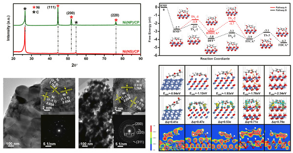 制备获得的镍纳米片/碳纸复合电极能够在较低的反应电位(1.36VRHE)下高选择性电催化HMF氧化生成2,5-呋喃二甲酸(FDCA)并耦合高效析氢反应,反应体系对目标产物FDCA的选择性和产率均接近100%,生成H2的法拉第效率为95.3%,且该催化剂展示出较高的稳定性,经多次重复利用后仍无活性衰减现象。关联镍纳米片/碳纸复合电极材料的活性与结构可以发现这种优异的催化性能主要来源于碳纸上负载的镍纳米片较低的结晶度、更多的边缘位点以及独特的电子结构。处于边缘位缺电子状态的镍单质容易在反应过程中被原位氧化为具有更高价态的Niδ+物种(NiO 或 NiOOH细小晶粒),从而显著提高了镍纳米片/碳复合电极的催化活性。第一性原理计算明确了催化反应路径并揭示了催化活性的提高主要来源于Niδ+物种对HMF更有利的吸附构型、较强的吸附能和较低的基元反应步骤能垒。