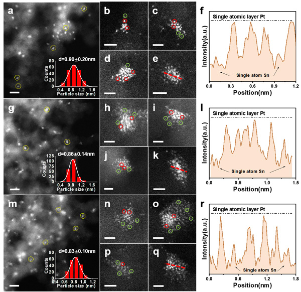 图1 Pt3团簇催化剂的球差电镜表征与分析:(a)-(f) Pt1.7Sn/ND@G, (g)-(l)Pt3.4Sn/ND@G, (m)-(r) Pt6.8Sn/ND@G
