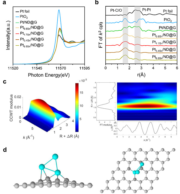 图2 (a-c) 催化剂同步辐射(XAFS)表征结构, (d) Pt3-Gr模型示意图(左:侧视图,右:俯视图)