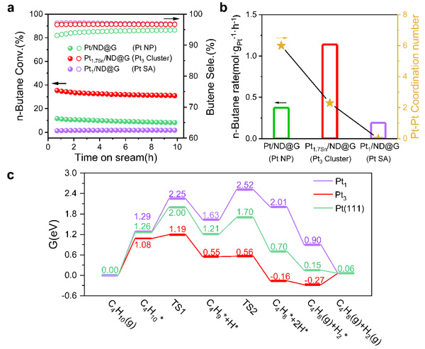 图3 (a, b) 催化剂脱氢催化活性, (c) 在Pt1-Gr、Pt3-Gr和Pt(111)结构模型上丁烷脱氢能量变化曲线