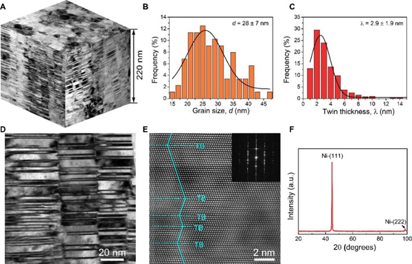 图1 λ=2.9nm的纳米孪晶Ni的微观结构。(A)典型的三维结构,包括平面图和截面图。(B)和(C)分别为孪晶片层厚度和柱状晶粒宽度的分布图。(D)高倍TEM截面图像。(E)高分辨TEM图,插图为相应的选取电子衍射花样。(F)XRD曲线,表现为强烈的(111)织构。