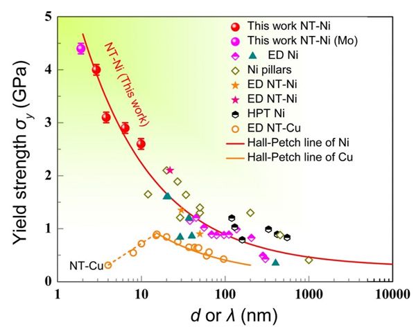 金属材料的强化是长期以来材料领域的核心研究方向。细晶强化(即Hall-Petch强化,包括晶界强化/孪晶界强化)是目前最常用且有效的强化手段之一,其内在机制是源于晶界/孪晶界对位错运动的阻碍。然而,当晶粒尺寸(d)和孪晶片层厚度(λ)达到某个临界尺寸(10-15nm)时,材料的主导变形机制将转变为晶界运动或退孪生,从而使其表现出Hall-Petch关系失效或软化效应(即材料强度随着d/λ的降低而不再增加甚至降低),成为了材料强度提升的瓶颈问题。