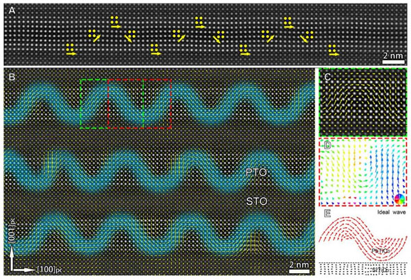 图2:(A) 一个PbTiO3/SrTiO3周期的HAADF-STEM图像;(B, C, D) 电偶极子波的极化分布图与细节图;(E) 一个电偶极子波的示意图。