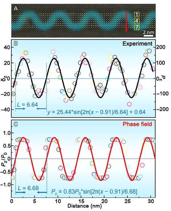 图3:(A) 一个PbTiO3/SrTiO3周期的极化分布图像;(B, C) 电偶极子波的正弦函数关系曲线拟合。