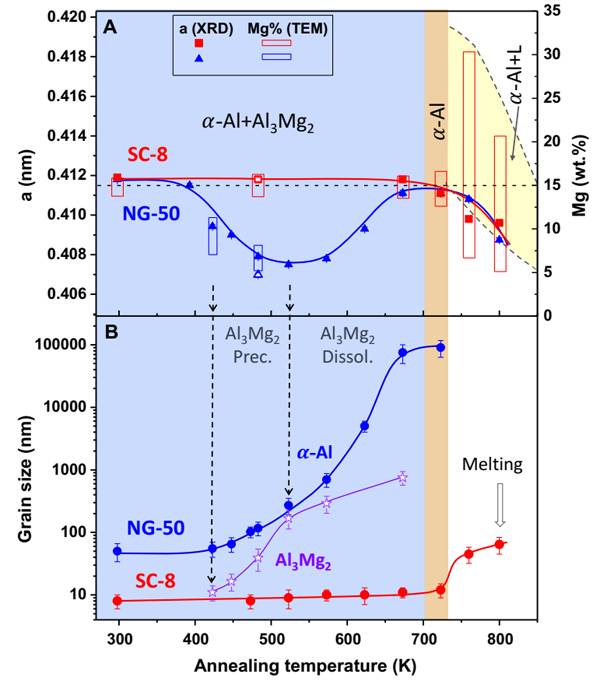图2. Al-Mg合金受限晶体的(SC-8)晶格常数、晶格中镁含量及晶粒尺寸随退