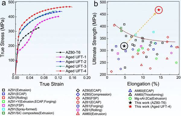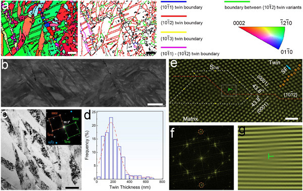 镁合金的密度是钢铁的1/4、铝合金的2/3,是最轻的金属结构材料,但低的绝对强度和耐蚀性极大限制了其实际工程应用。通常采用的剧烈塑性变形(SPD)方法对镁合金强度的大幅提升较为有效,可制备出超细晶超高强镁合金。然而,具有密排六方结构镁合金较差的冷变形能力,需在较高温度条件下进行SPD加工处理,极易造成晶粒长大,难以获得超细晶组织。更为严重的是,传统SPD制备的超细晶所形成非平衡晶界会显著降低镁合金的耐蚀性。此外,传统SPD制备的超细晶镁合金样品尺寸小,难以在工程中获得应用。早期研究表明,孪晶组织也可用于细化晶粒,提高强度,且孪晶界的能量低,不会对镁合金耐腐蚀性能造成显著影响。然而,镁合金中最易启动的拉伸孪晶界面在应力作用下易长大和合并。因此,高密度超细孪晶组织的制备是亟需解决的关键问题。