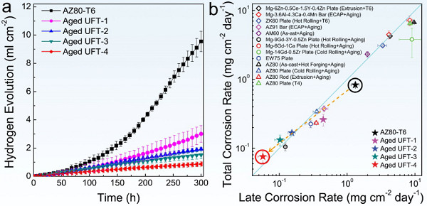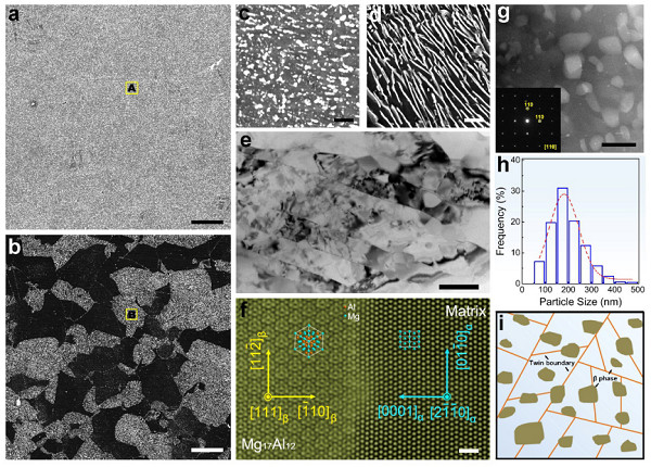 近日,耀彩网中科院核用材料与安全评价重点实验室许道奎研究员团队与南京工业大学信运昌教授课题组合作在制备高强高耐蚀镁合金材料方面取得重要进展。他们采用多道次三向压缩技术制备孪晶组织,通过对压缩路径及道次应变的独特设计,利用12道次低应变和高应变循环交替压缩,在AZ80镁合金中成功地制备出平均片层厚度约为200 nm的高密度孪晶组织,使平均晶粒尺寸从初始材料的33 mm左右细化至300 nm,其抗拉强度高达469 MPa,是已报道该系列镁合金中强度最高的。利用高密度超细孪晶组织细化晶粒,不仅避免了非平衡晶界对耐腐蚀性能的不利影响,而且改变了β-Mg17Al12相的形貌及分布。β-Mg17Al12析出相呈颗粒状,细小且均匀分布在镁基体中,显著抑制了局部腐蚀的发生,将腐蚀速率降低了一个数量级。该研究成果以“Evading strength-corrosion tradeoff in Mg alloys via dense ultrafine twins” 为题发表在《自然·通讯》(Nature Communications)上。