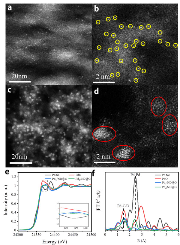 图1. (a,b) 亚纳米尺度Pd单原子(Pd1/ND@G) 的球差电镜表征;(c,d) 亚纳米尺度全暴露Pdn金属团簇(Pdn/ND@G)的球差电镜表征; (e,f) 催化剂同步辐射(XAFS)表征结构。