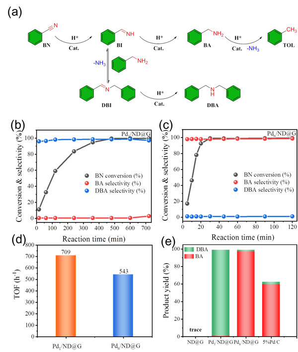 图2.(a)苯甲腈加氢反应过程示意图;(b-e)催化剂加氢催化活性。