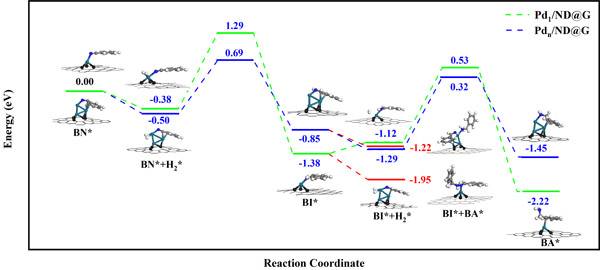 图3. Pd1-Gr和Pdn-Gr结构模型上苯甲腈加氢能量变化曲线。