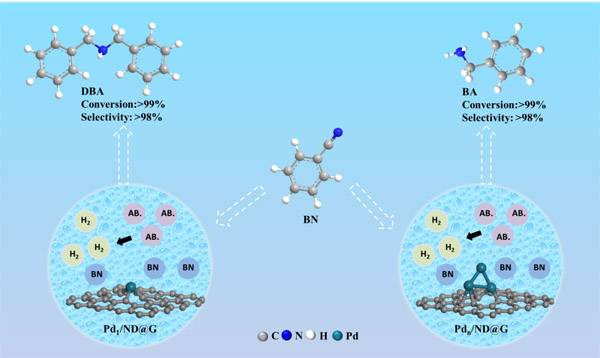 图4. 亚纳米尺度下Pd单原子与全暴露Pdn金属团簇活性中心结构与苯甲腈加氢示意图。