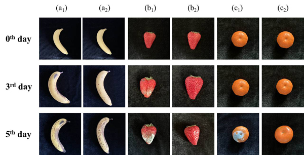 图1 随着时间延长,放置在304不锈钢和304-Cu不锈钢餐盘中的新鲜水果的外观变化,(a)香蕉;(b)草莓;(c)沙糖桔。下角标:1=304不锈钢;2=304-Cu不锈钢。