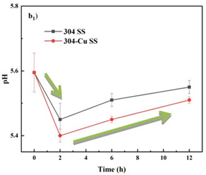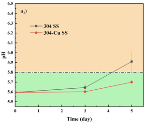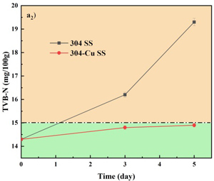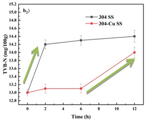 图2 在不同放置温度下,在304不锈钢和304-Cu不锈钢餐盘中的冷鲜肉的pH值和盐基氮(TVB-N)值变化情况,(a)4℃±1℃;(b)23℃±2℃。下角标:1=pH;2=TVB-N
