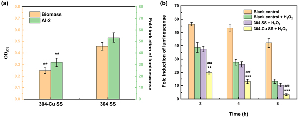 图4 (a)304不锈钢和304-Cu不锈钢与E.coli共培养10小时后,其表面生物膜形成量及对应的AI-2信号表达水平;(b)不同处理组对AI-2信号活性的影响。
