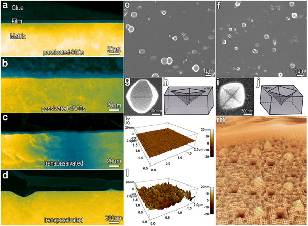 图1:金属/钝化膜界面的晶面重构。(a-b)单晶合金在0.5 mol L-1 H2SO4溶液中0.4V/SCE钝化900s和4500s的HAADF-STEM像;(c-d)单晶合金在0.5 mol L-1H2SO4 溶液中先在0.4V/SCE下钝化900s,而后在1.1V/SCE过钝化3600s的HAADF-STEM像; (e-f)SEM图像表明过钝化处理在(110)表面及(001)表面上形成不同外形的凹坑;(g-j)不同表面上凹坑的局部放大图及示意图; (k-l)钝化和过钝化表面的AFM图像; (m)过钝化后的形貌示意图,表面的起伏由密排的{111}晶体学面构成。