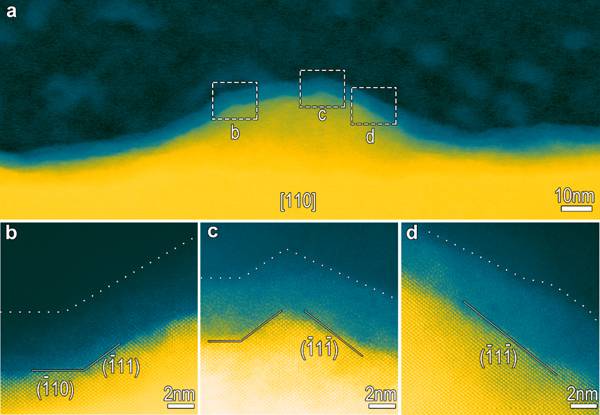 图2:过钝化处理将界面修饰成由密排{111}晶体学面构成的低能界面。(a)起伏界面的HAADF-STEM像;(b-d)图a中标示位置的局部放大图。