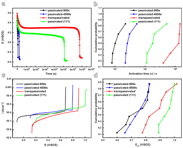 图3:低能密排界面提高材料的耐还原溶解及抗点蚀能力。(a)室温下FeCr15Ni15单晶合金在5.6 mol L-1H2SO4 溶液中的开路电位衰减曲线,密排{111}界面的形成显著延长了活化时间;(b)活化时间的累计概率分析;(c)不同条件处理的FeCr15Ni15单晶合金在3.5%NaCl溶液中(50℃)的动电位极化曲线;(d)点蚀电位的累计概率分析。
