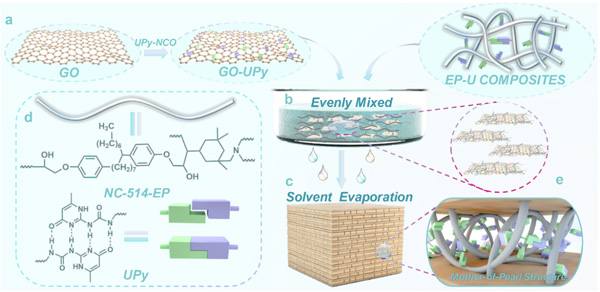 图1:自修复仿生纳米材料的构建策略示意图。 (a) GO与生物基环氧树脂的预处理和混合路线; (b) 通过搅拌分散机获得的高分子纳米材料的悬浮体系; (c) 溶剂蒸发得到的珍珠状纳米复合材料; (d) 生物基聚合物网络和具有超分子四重氢键的UPy的结构图;(e) 人造珍珠层的结构和超分子氢键缔合的原理。