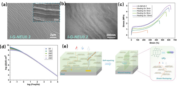图2:仿生纳米复合涂层:横截面显微示意图(a)SEM和(b)TEM;(c)Stress-Strain曲线;(d)在 3.5 wt% NaCl 溶液中浸泡 45 天的电化学EIS图;(e)防腐蚀机制与自修复原理示意图。