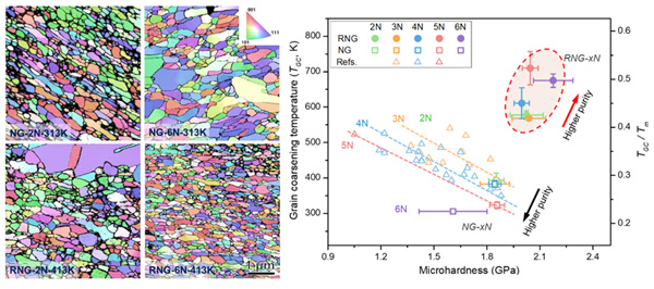 图:左图为2N和6N铜纳米晶(nanograins,NG)和弛豫态纳米晶(relaxed nanograins,RNG)在典型温度退火后的晶粒图片对比;右图为本工作和文献中不同纯度铜样品热稳定性(晶粒粗化温度)和显微硬度分布关系图。