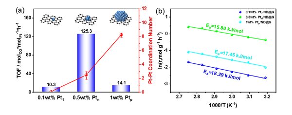 图2. (a)不同Pt/ND@G样品在30℃时的CO氧化性能图,和(b)表观活化能(Ea)。