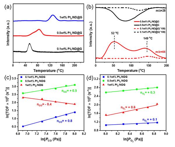 图3. (a)不同Pt/ND@G催化剂的CO-TPD图,(b) CO-TPSR图,(c)CO和(d)O2分压对不同Pt/ND@G上TOF的影响。