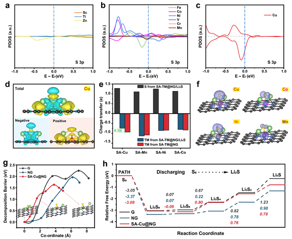 图1. 第一性原理计算吸附于金属单原子催化剂位点的硫化锂的电子结构和反应能垒。