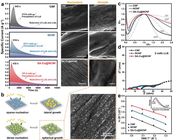 锂硫电池具有能量密度高(2600 Wh kg-1)、硫单质成本低廉和环境友好等优势,在替代锂离子电池的新一代电化学储能体系中极具竞争力。硫正极的容量发挥与复杂的“固-液-固”多步反应动力学紧密相关,尤其是硫化锂的沉积/解离过程,贡献了锂硫电池正极充放电容量的四分之三,是影响性能的重要过程。然而,硫化锂的绝缘性导致了电化学过程需要克服较高反应活化能;电化学过程中硫化锂形成是平面生长,造成了电极表面的快速钝化,从而导致硫化锂的沉积/解离过程,动力学缓慢和效率低。近年来,过渡金属基催化剂用于硫正极可有效降低反应能垒,促进电荷转移,提高活性物质的利用率,但放电过程中,产物硫化锂会覆盖催化位点,降低后续反应的电催化活性。电池体系中催化剂诱导的反应物(产物)的导电属性变化对性能的影响,尚未得到充分的认识和研究。