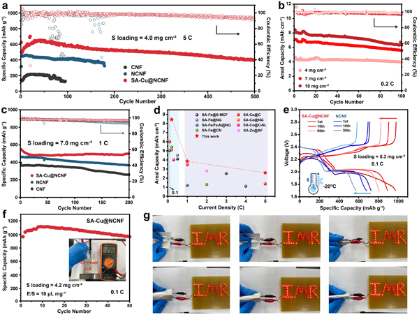图3. 高硫载量下锂硫电池的循环性能和软包电池展示。