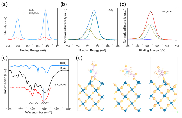 图1 PL-A处理SnO2薄膜的XPS图谱:(a)Sn 3d精细谱、(b)未处理薄膜O 1s精细谱、(c)PL-A处理后薄膜O 1s精细谱,(d)PL-A处理前(蓝线)后(红线)SnO2薄膜和纯相PL-A(黑线)的FTIR图谱,(e)PL-A在SnO2(010)晶面上的分布示意图,图中粉色、黄色、浅粉色、浅蓝色和蓝色原子分别代表C、H、O、N和Sn原子。