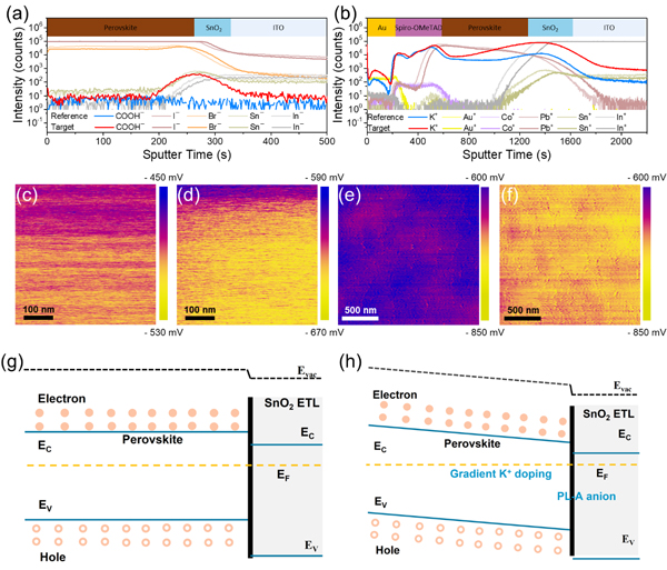 图2 (a)PL-A处理前(参比样品)和处理后(目标样品)ITO/SnO2/Perovskite复合结构的阴离子纵向分布曲线,(b)PL-A处理前后ITO/SnO2/perovskite/Spiro-OMeTAD/Au器件中的阳离子纵向分布曲线,PL-A处理前后SnO2以及钙钛矿表面的电势分布:(c)未处理SnO2薄膜、(d)PL-A处理后SnO2薄膜、(e)在未处理SnO2薄膜表面生长的钙钛矿薄膜、(f)在PL-A处理后SnO2薄膜表面生长的钙钛矿薄膜,PL-A处理前(g)和处理后(h)器件埋底界面能级结构示意图。