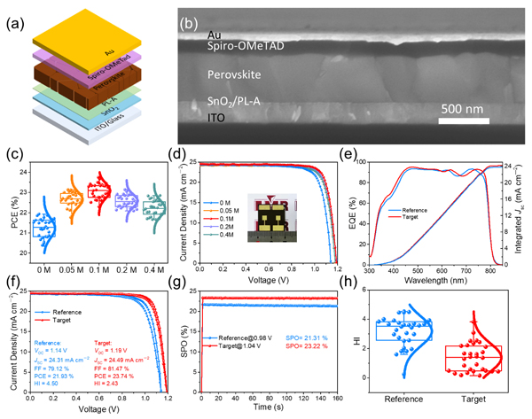 图3 钙钛矿太阳能电池器件的结构示意图(a)和SEM截面图像(b),利用不同浓度PL-A处理的器件能量转换效率统计结果(c)和最佳J-V曲线(d),PL-A处理前后最佳性能器件的IPCE曲线(e)、J-V曲线(f)、SPO曲线(g)和回滞因子HI统计结果(h)。