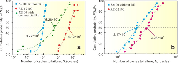 图1 稀土轴承钢与不加稀土的轴承钢、添加商业稀土的轴承钢的拉压疲劳和滚动接触疲劳寿命对比