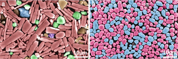 研究人员利用自主发明的夹杂物萃取三维表征技术,分析了稀土GCr15轴承钢和进口的某轴承钢中的夹杂物形貌,发现在三维尺度上进口轴承钢中以氧化铝和大尺寸硫化锰夹杂物为主(图2a),而稀土轴承钢中夹杂物主要是细小的球状稀土氧硫化物(图2b)。更为重要的是稀土氧硫化物的硬度仅为氧化铝的1/5左右,略高于轴承钢基体硬度,与脆硬的氧化铝夹杂物相比,尺寸细小、与基体硬度匹配性良好的稀土氧硫化物在疲劳加载过程中可以发生塑性变形,引发夹杂物周围应力集中显著减小,有效延缓了疲劳裂纹的萌生。