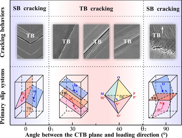 双晶共格孪晶界面疲劳开裂机制:共格孪晶界面与加载轴的夹角决定了两侧晶粒内开动的主滑移系,对其界面疲劳损伤机制起决定性作用。当共格孪晶界面与加载轴成20°-70°时,受附加应力及特殊位错滑移的影响,滑移带易于集中在共格孪晶界面附近,因而疲劳裂纹优先沿共格孪晶界面萌生和扩展(如图1(II-IV)所示);而当共格孪晶界面近似平行或垂直于加载轴时,滑移带或完全穿过共格孪晶界面,或因取向较硬受限与界面附近,塑性变形主要集中于晶内滑移带处,使滑移带优先萌生疲劳裂纹(如图1(I)、(V)所示)。