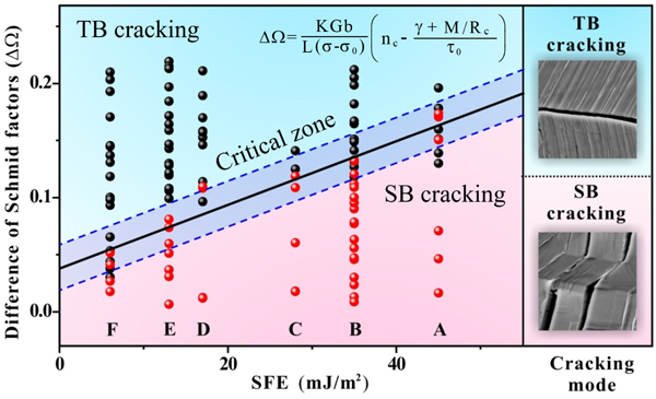 多晶体孪晶界面疲劳开裂机制:多晶体疲劳过程中孪晶界附近应力状态复杂,与双晶中孪晶开裂稍有不同。团队利用原创的晶体滑移形貌定取向方法,对不同成分或层错能的铜合金多晶体中孪晶界疲劳开裂行为进行了系统研究,结果发现:铜合金的层错能越低,孪晶界两侧的取向差越大,位错越容易在孪晶界处产生塞积,因而孪晶界越容易疲劳开裂,反之,则是滑移带更容易疲劳开裂。通过提炼晶体取向Schmid因子差和合金层错能,结合位错塞积理论,建立了层错能和取向为参数的孪晶界面疲劳开裂定量判据(图3)。