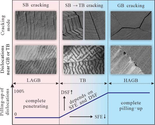 图4 大角晶界、孪晶界、小角晶界低周疲劳损伤开裂难易程度比较。