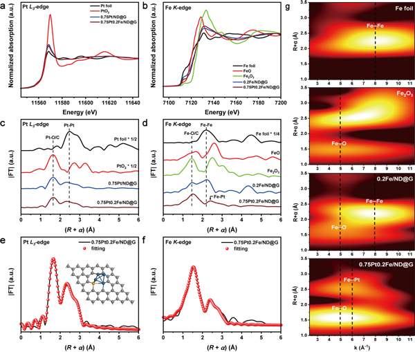 图2 全暴露PtFe双金属团簇(0.75Pt0.2Fe/ND@G)的XAFS表征