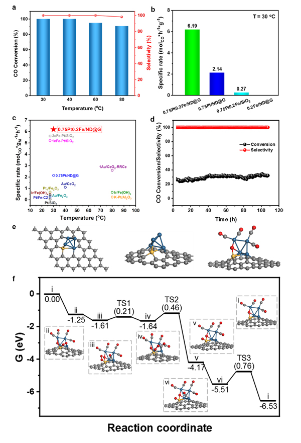 图3 全暴露PtFe双金属团簇(0.75Pt0.2Fe/ND@G)的PROX反应催化性能以及理论计算研究