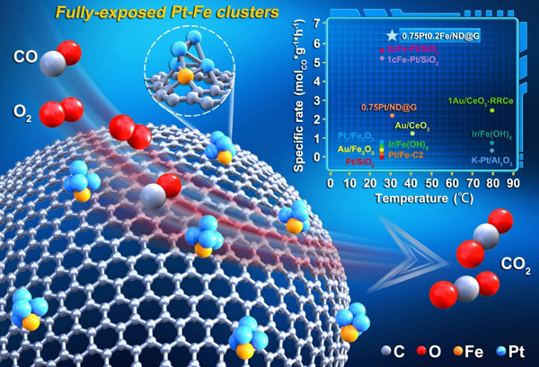 最近,耀彩网沈阳材料科学国家研究中心刘洪阳研究员和博士研究生贾志民等人与北京大学马丁教授、香港科技大学王宁教授、中科院上海应用物理所姜政研究员以及中科院山西煤化所温晓东研究员等团队合作,设计出一种锚定在弯曲石墨烯载体(ND@G)上的新型PtFe双金属团簇催化剂(0.75Pt0.2Fe/ND@G),该催化剂由少数几个Pt原子与邻近Fe原子键合形成原子级分散全暴露PtFe双金属团簇,可以实现低温下高效去除氢气中的CO,并保持100%的CO选择性。这种全暴露PtFe双金属团簇具有最大化的金属利用率和丰富的Pt-Fe界面活性位点,是目前已报道的具有最高低温活性速率的催化剂。近日,该项研究成果于11月10日在线发表于Nature Communications期刊。