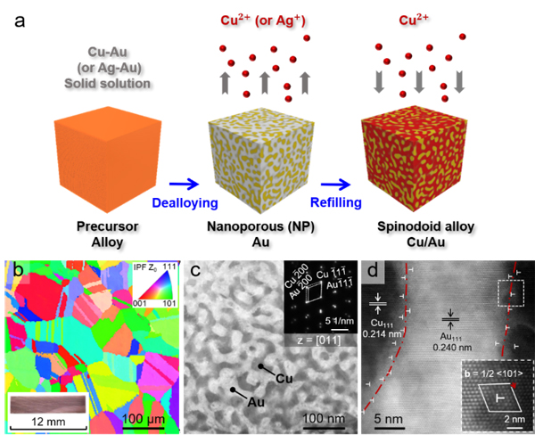 图1 仿调幅分解结构Cu/Au合金的制备及结构特征。a) 脱合金与电沉积结合形成仿调幅分解结构的示意图。b)EBSD照片显示该材料粗大的晶粒尺寸,c)TEM照片显示其双连续纳米双相结构,以及d)HRTEM照片显示半共格界面和高密度失配位错。